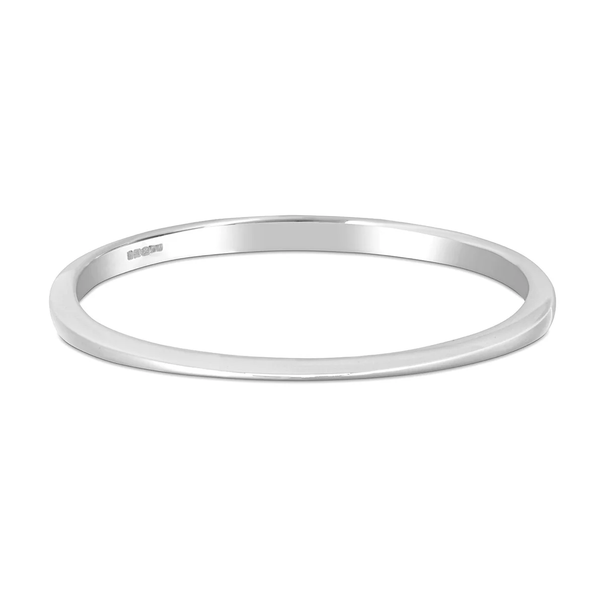 Handcrafted slim oval bangle in solid 925 sterling silver with a bright polished finish, hallmarked at the London Assay Office.