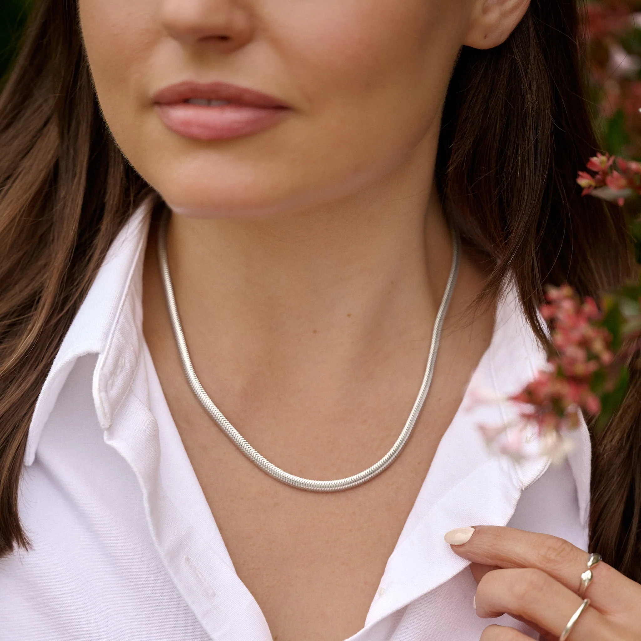 The snake chain necklace is crafted by skilled artisans using traditional methods and the finest oval-shaped sterling silver chain. It features our classic Albert clasp.