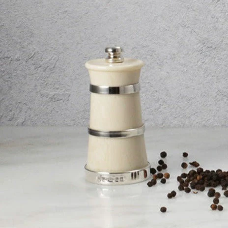 Butter churn–style mill made with a durable ivory alternative and handcrafted silver details, perfect for a Victorian-inspired table setting.
